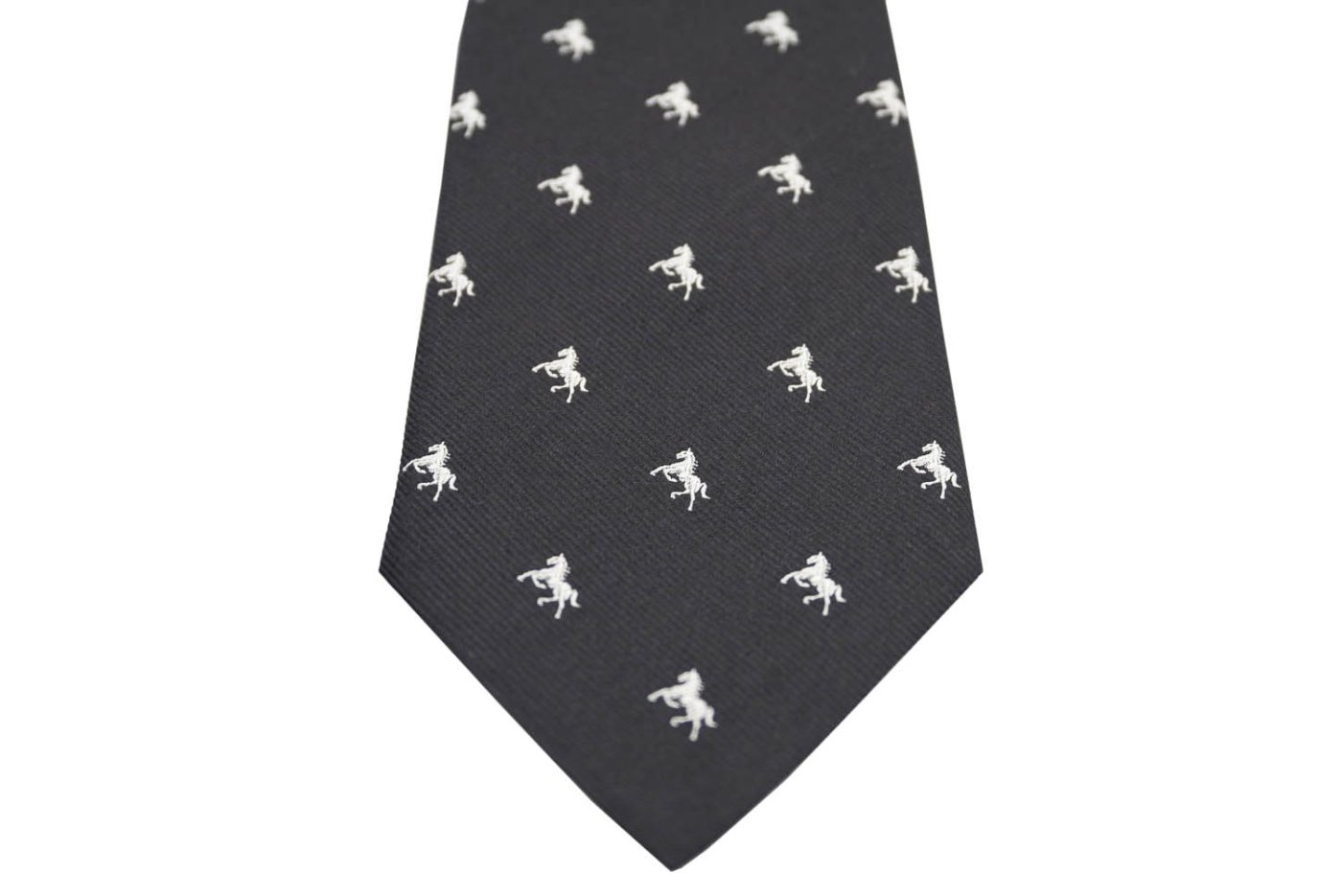 Μαύρη μεταξωτή γραβάτα με λευκά σχέδια αλόγων, που προσθέτει παιχνιδιάρικο αλλά κομψό χαρακτήρα σε κάθε κοστούμι, ιδανική για ξεχωριστές εμφανίσεις με στυλ και προσωπικότητα.
