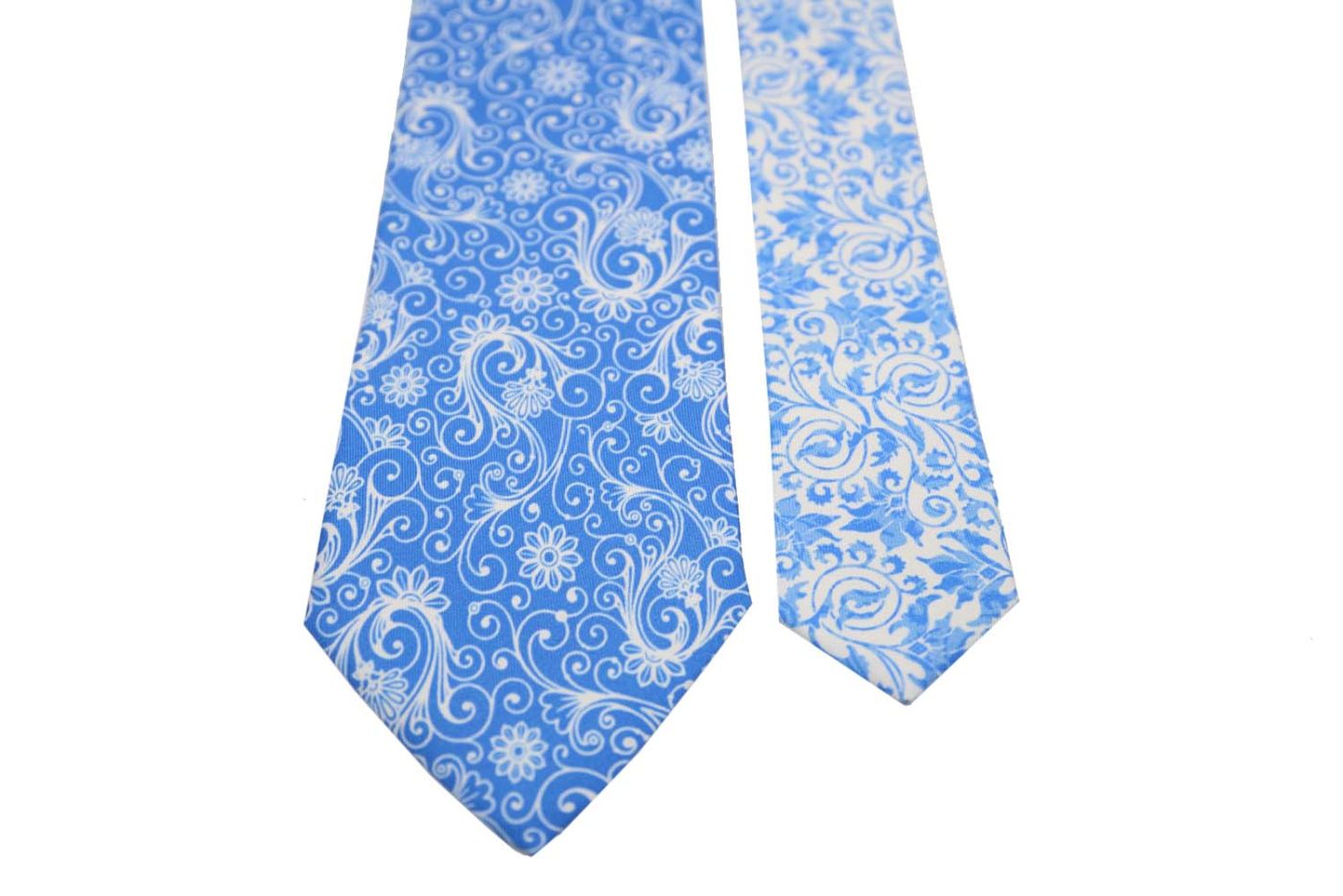 Μπλε γραβάτα με κομψό μοτίβο από λευκά λαχούρια, σχεδιασμένη για διαχρονική κομψότητα. Κατασκευασμένη από απαλό μετάξι, με φίνα υφή που δένει εύκολα και πέφτει φυσικά. Το πίσω μέρος είναι φοδραρισμένο με το ίδιο ύφασμα, και η μεγαλύτερη λεπτομέρεια είναι η αντίστροφη χρωματική εκδοχή στο πίσω κομμάτι της γραβάτας: λευκή βάση με μπλε λαχούρια, προσθέτοντας μια διακριτική αλλά ιδιαίτερη λεπτομέρεια πολυτέλειας.