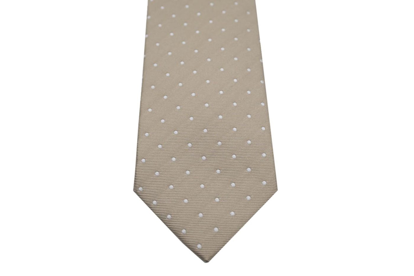 Μπεζ-μπρονζέ γραβάτα με λευκά πουά, ένας ζεστός και εκλεπτυσμένος συνδυασμός που αποπνέει διακριτική πολυτέλεια. Προσθέτει κομψότητα και βάθος στην εμφάνιση, διατηρώντας ένα ισορροπημένο και διαχρονικό ύφος, ιδανικό για προσεγμένες και κομψές επιλογές.