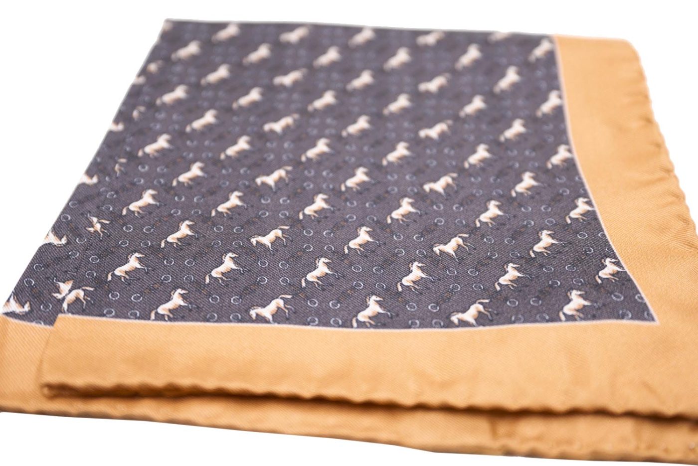 Σκούρο καφέ μαντήλι τσέπης με μπεζ-καφέ αλογάκια και στομίδες στο σχέδιο, με πορτοκαλί περίγραμμα. Ένα εκλεπτυσμένο και ιδιαίτερο αξεσουάρ που δίνει ένταση και χαρακτήρα στην εμφάνιση.