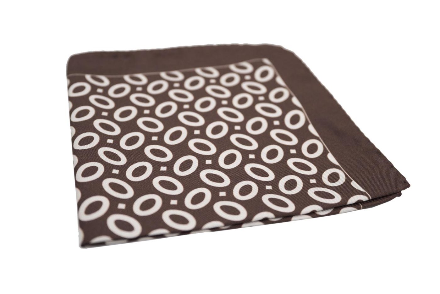 Καφέ μαντήλι τσέπης με λευκά κυκλικά σχέδια και καφέ περίγραμμα. Ένα διαχρονικό και κομψό αξεσουάρ που προσθέτει φινέτσα και προσωπικότητα στην εμφάνιση.