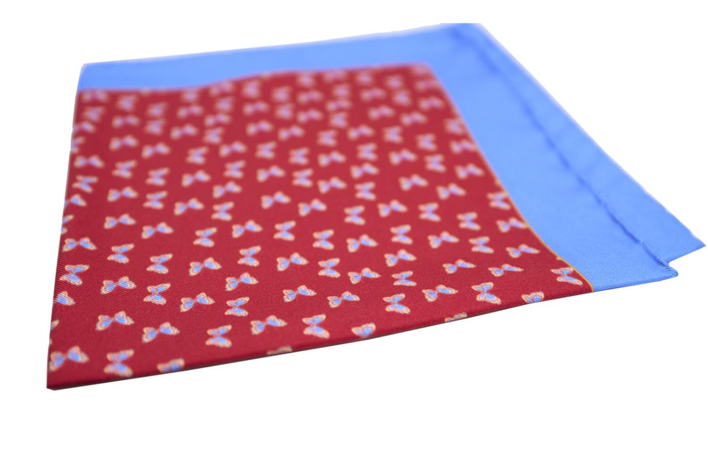 Κόκκινο μαντήλι τσέπης με διακριτικό μοτίβο πεταλούδων και κομψό μπλε περίγραμμα. Ένα ιδιαίτερο αξεσουάρ που συνδυάζει ένταση και φινέτσα, ιδανικό για να δώσει μοναδικό χαρακτήρα σε κάθε εμφάνιση.