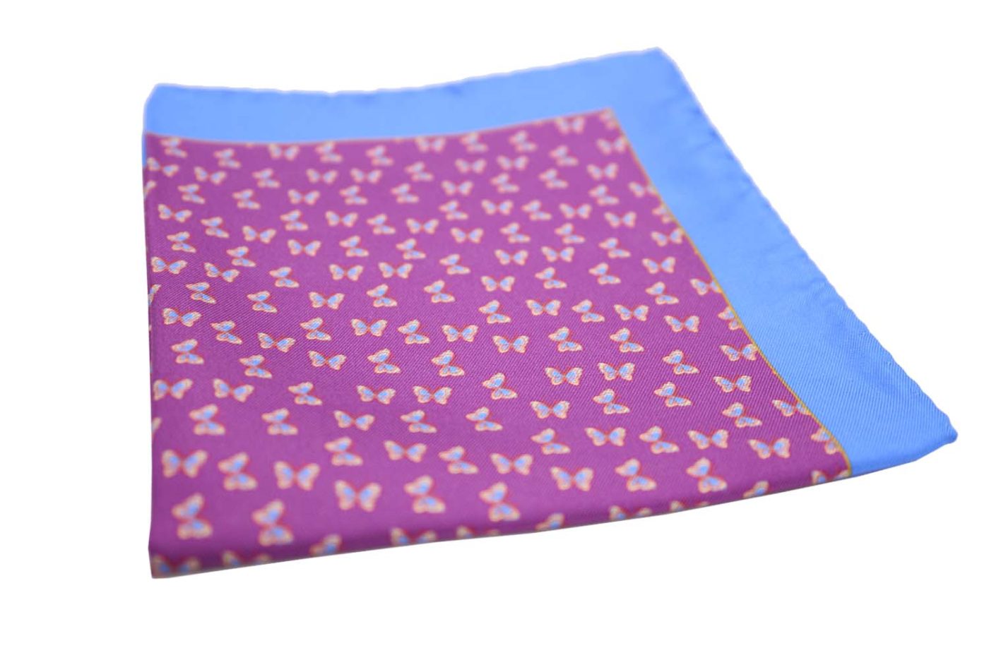 Μωβ μαντήλι τσέπης με μπλε πεταλούδες και μπλε περίγραμμα — απλά φανταστικό. Ένα αξεσουάρ γεμάτο κίνηση, φαντασία και κομψότητα, που δίνει ζωή στο σύνολο και τραβάει το βλέμμα με την πρώτη ματιά.