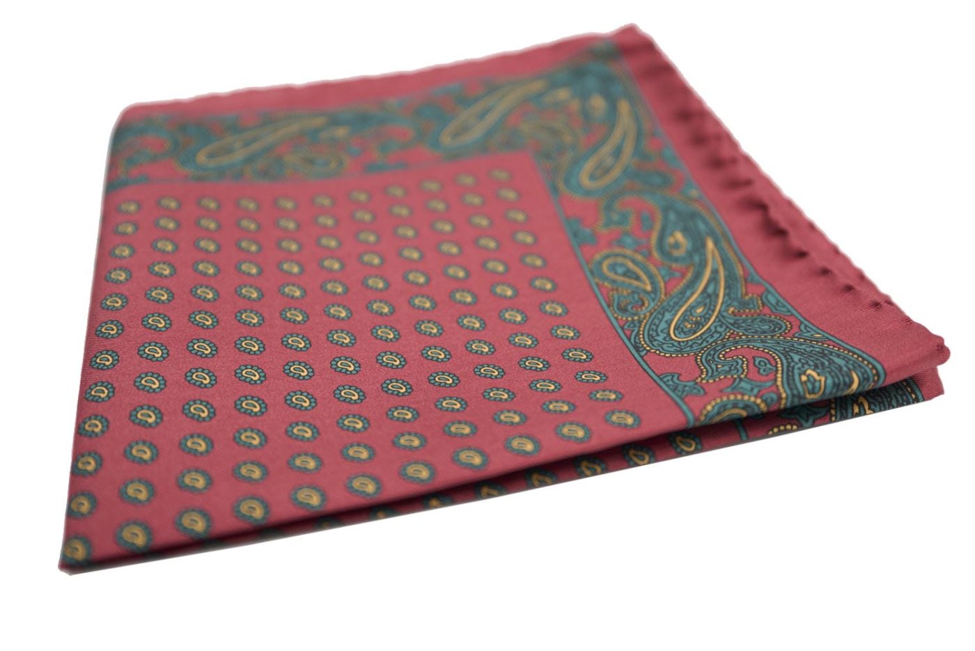 Μπορντό μαντήλι τσέπης με πράσινα λαχούρια και κίτρινες λεπτομέρειες. Ένα εκλεπτυσμένο αξεσουάρ με πλούσια χρώματα, ιδανικό για να προσθέσει βάθος και χαρακτήρα σε κάθε κομψή εμφάνιση.